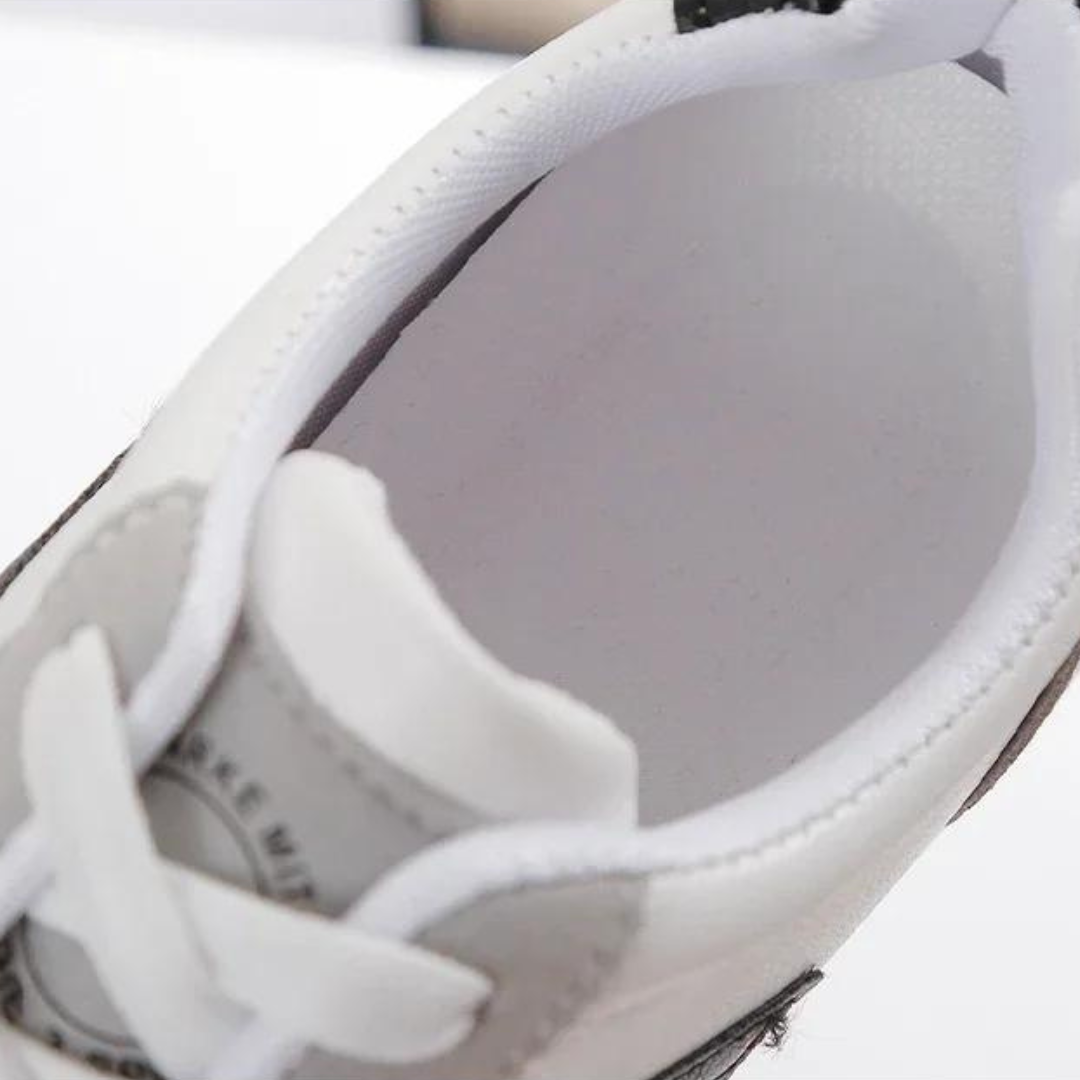 Le chaussure comporte une semelle orthopédique qui soutient les pieds, tandis que le matériau supérieur est respirant.
